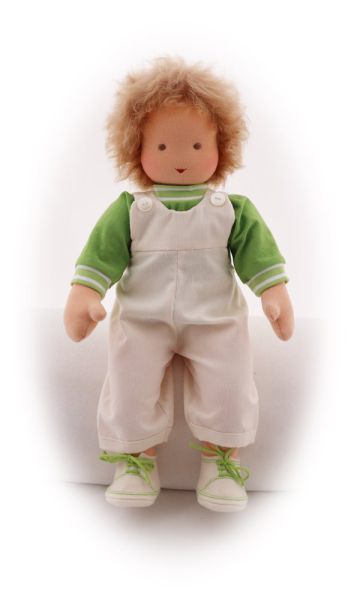 Bei Puppen der Größe M (46-48cm) sind die Hosenbeine 3/4 lang Puppen-Latzhose aus Baumwolle mit Latz und Zierknöpfen und Klettverschluss
