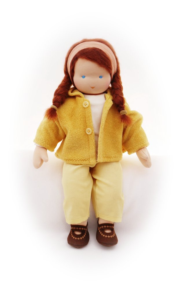 PUPPENKLEIDUNG: Puppenpullover ecru (801), Puppenhose gelb (203), Puppen-Kapuzenjacke zartgelb (615), Puppenschuhe aus Filzstoff braun (952)