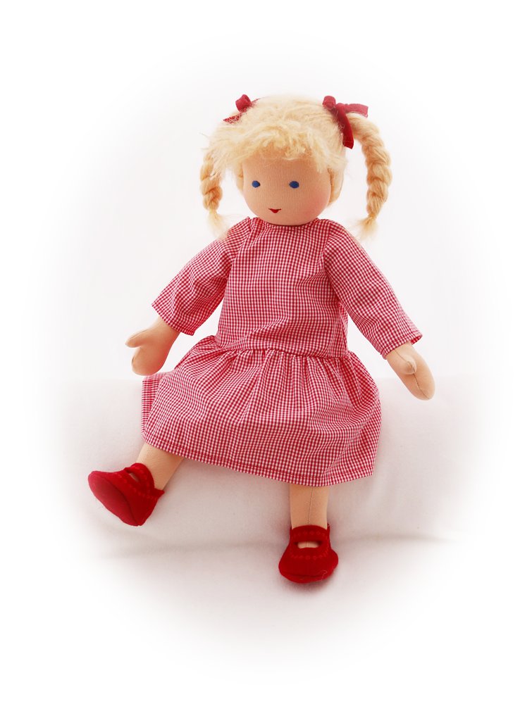 PUPPENKLEIDUNG: Puppenkleid rot-kariert (532), Jersey-Pumphöschen/Unterhose (1100), Puppenschuhe aus Filzstoff rot (907)