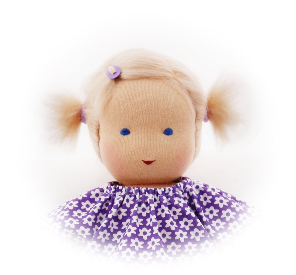 PUPPENKLEIDUNG: Puppenkleid violett weiße Bümchen (81-1), Filz Puppensandale ecru (91)
