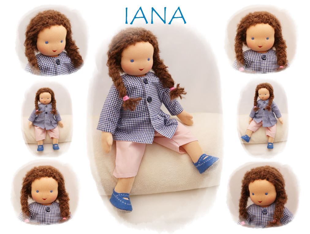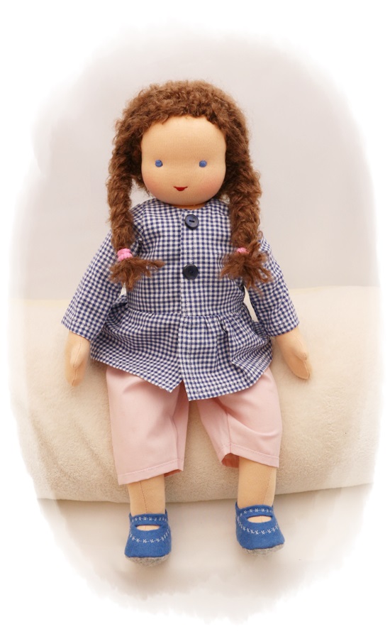 PUPPENKLEIDUNG: Puppenbluse blau kariert (109), Puppenhose hellrosé (207), Puppenschuhe aus Filzstoff (905)