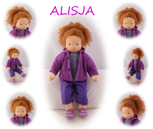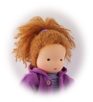 PUPPENKLEIDUNG: Puppenpullover dunkelviolett gestreift (813), Puppenhose lila (209), Puppenschuhe aus Filzstoff flieder (901), Puppen-Kapuzenjacke violett (603)