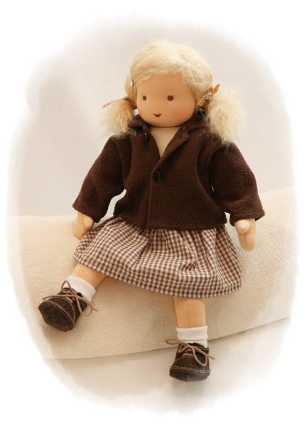 PUPPENKLEIDUNG: Puppenkleid braun kariert (515), Pumphöschen weiss (1100), Puppen-Kniestrümpfe weiss (1108), Puppen-Kapuzenjacke braun (606), Puppenfilzschuhe dunelbraun (945)