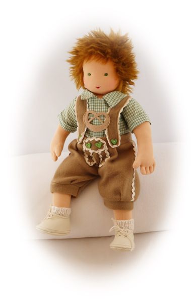 PUPPENKLEIDUNG: Puppen-Zweiteiler Tracht (IF-552), Puppensöckchen weiss (20), Puppenlederschuhe mit Schnürsenkeln ecru (935)