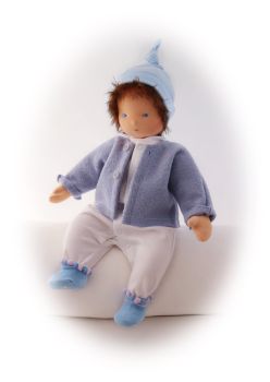 PUPPENKLEIDUNG: Puppenstrampler weiss (1121), Puppenwindel (1102), Puppen-Wolljacke hellblau (415), Knotenmützchen hellblau (1124), Puppen-Söckchen hellblau (1107-3)