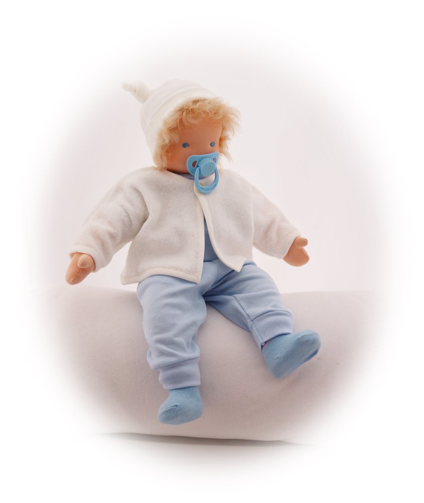PUPPENKLEIDUNG: Puppen-Jogginghose hellblau (IF-316), Puppenbody hellblau (IF-1113), Puppen-Söcchen hellbau (IF-1107), Puppenjacke weiss (320), Knotenmützchen ecru (IF-1127)