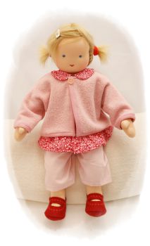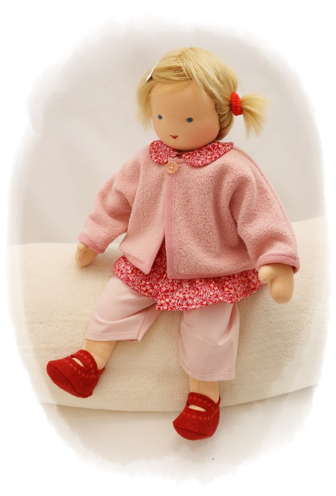 PUPPENKLEIDUNG: Puppenbluse rot geblümt (118), Puppenhose hellrosé (207), Puppenjacke zartrosa (324), Puppenschuhe aus Filzstoff weinrot (907)
